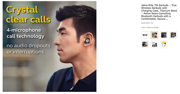 3rd April 2022 Jabra Elite Earbuds - Amazon Listing Jabra Elite 75t Earbuds – True Wireless Earbuds with Charging Case, Titanium Black – Active Noise Cancelling Bluetooth Earbuds with a Comfortable, Secure Fit, Long Battery Life, Great Sound